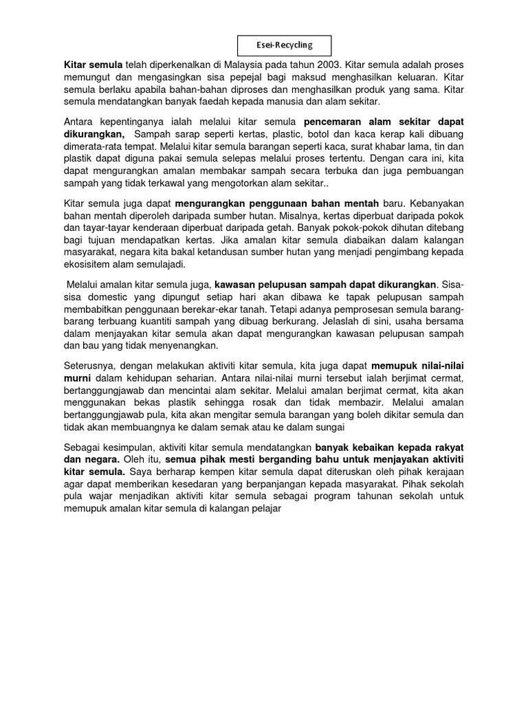 Sebagai contoh jumlah minyak adalah terhad dimana daripadanya kita boleh buat plastik dan bijih aluminium bagi membuat tin minuman. Kitar semula di negara lain Add to my workbooks 3 Download file pdf Embed in my website or blog Add to Google Classroom. Guna semula adalah menggunakan semula barang-barang yang telah dipakai bagi tujuan yang lain.